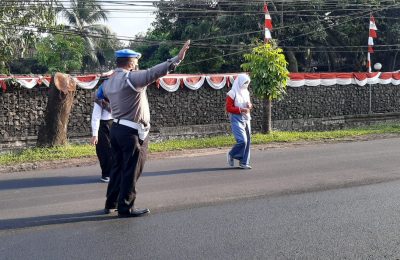 Protap Pengaturan Lalulintas Polsek Warunggunung Bantu Pelajar Menyebrang dan Antisipasi Kemacetan