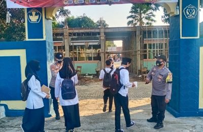 Sekolah Mulai Tatap Muka, Bhabinkamtibmas Polsek Kota Pandeglang Ikut Kawal Pengecekan Suhu Tubuh Para Siswa
