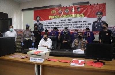 SERANG, Direktorat Reserse Kriminal Umum (Dirreskrimum) Polda Banten ungkap kasus sindikat pemalsu surat hasil swab antigen Covid-19 di Kawasan Pelabuhan Merak,...