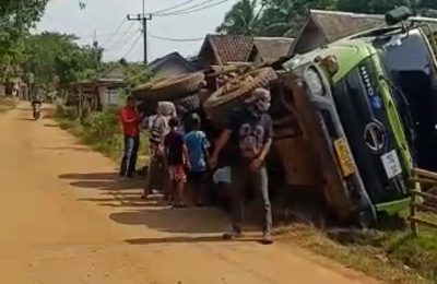 Truk Tronton Pengangkut Tanah Merah Proyek Jalan Tol Serang – Panimbang Terguling di Desa Pasirkadu