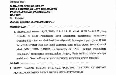 Dugaan Pengecoran Bahan Bakar Bersubsidi Jenis Pertalite ke Drigen, Aktivis JPMI Layangkan Surat Audiensi PANDEGLANG, Globalmediatama.com – Terkait adanya dugaan...