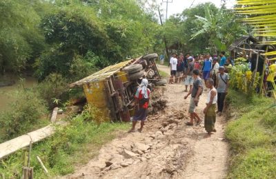 Akibat Jalan Cimoyan Patia Rusak Berat Mobil Pengangkut Kayu Terbalik