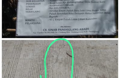 PANDEGLANG,- Diduga Karena Lemahnya fungsi pengawasan dari Dinas terkait, Pelaksanaan Pembangunan Rabat Beton di Desa Sumurbatu Kecamatan Cikeusik Kabupaten...