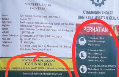 CV Sinar Jaya Obral Pesan K3 di Proyek Gedung BPP Patia “Pergunakan APD” Fakta atau Hanya Slogan? PANDEGLANG, detikPerkara.com – “Pergunakan...