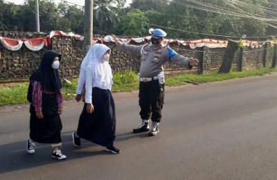 Protap pengaturan lalunitas Personil Polsek Warunggunung Bantu Pelajar Menyebrang dan Antisipasi Kemacetan
