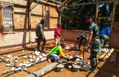 GM – Merangin, Pemasangan batu sungai di Satgas TMMD Reguler Ke 111 Kodim 0420/Sarko bersama masyarakat dalam renovasi Rumah Tidak Layak Huni (RTLH) milik...