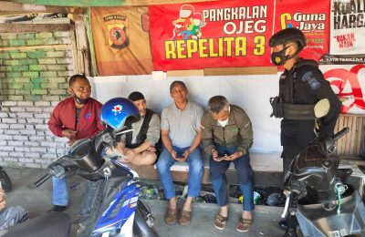 GM – Personel Kompi 1 Batalyon B Pelopor Satuan Brimob Polda Jabar Bripda Dzuri melaksanakan patroli sambang tukang ojek di pangkalan ojek Lembang Kabupaten...