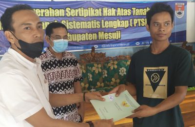 kades Abunawar Saat menyerahkan sertifikat program PTSL kepada warganya, Kamis (6/1/2022) Mesuji GM- Ratusan warga di Desa Bangun Mulyo Kecamatan Simpang Pematang...