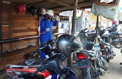 GM – Anggota Kompi 2 Batalyon A Pelopor Satuan Brimob Polda Jabar melaksanakan penyemprotan disinfektan di tempat fasilitas umum yaitu di Pangkalan ojek...