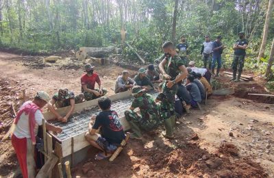 WAY KANAN – LAMPUNG globalinvestigasinews.com. Warga dan Anggota Satgas TMMD Ke-111 Kodim 0427/Way Kanan melakukan pemasangan papan cor dan perakitan besi...
