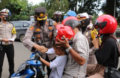 Kapolres Pandeglang Bagikan Helm dan Masker Kepada Pengendara